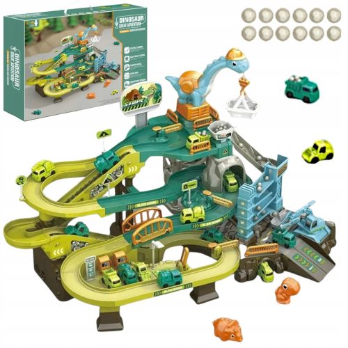 Duży tor samochodowy z dźwigiem w żywej kolorystyce, wyposażony w elektryczny podjazd oraz realistyczne sygnały dźwiękowe z motywem dinozaura. Bogatym i różnorodnym wyposażeniem będzie zachwycone każde dziecko, które uwielbia ciekawą zabawę.