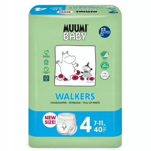 MUUMI Baby Pieluchomajtki Walkers rozmiar 4 wysokiej jakości pieluchomajtki, produkowane w Finlandii, wykonane są wyłącznie z czystych i bezpiecznych surowców. W procesie ich produkcji do wybielania masy celulozowej nie używa się agresywnego chloru, którego śladowe ilości pozostają w typowych pieluszkach, lecz tlenu przyjaznego zarówno dla skóry dziecka jak i środowiska.