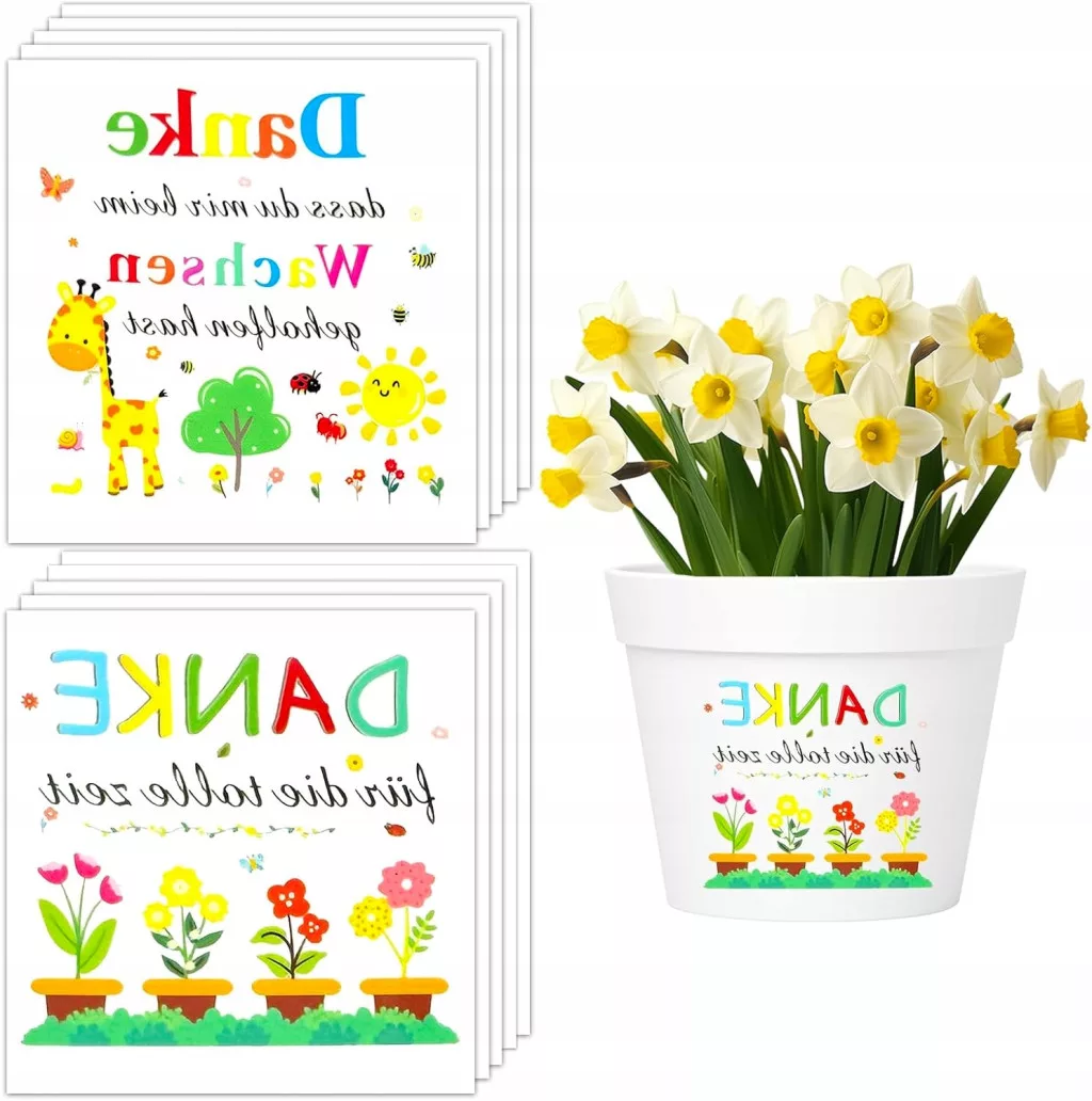 Zestaw zawiera 10 arkuszy naklejek z napisem 'Danke' w dwóch stylach, po 5 arkuszy w każdym stylu. Każda naklejka ma wymiary 10 × 10 cm. Wodoodporne i trwałe, idealne na rośliny doniczkowe i prezenty ????????.