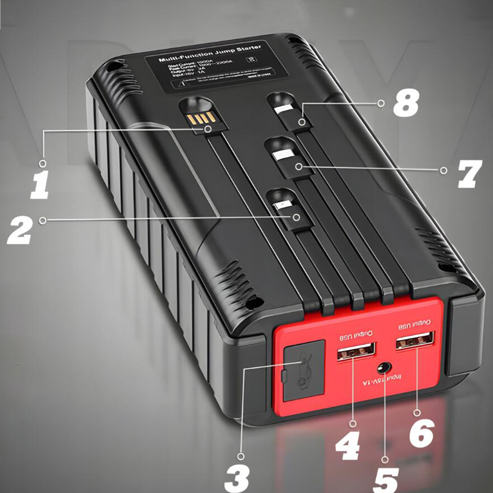 NAPAJALNIK ZA ZAGONSKE NAPRAVE 20000mAh 12V je idealna rešitev za zagon avtomobilov, motornih koles, telefonov in drugih naprav. Ta visokokakovostni power bank ponuja več kot 8 naprednih varnostnih funkcij, vključno s preprečevanjem nadpajanja, preobremenitve in prenapetosti. Poleg tega ima funkcijo brezžičnega polnjenja, kar omogoča enostavno in priročno polnjenje vaših naprav. Vgrajena svetilka s 2 načini delovanja zagotavlja dodatno funkcionalnost in varnost v sili. Z LCD zaslonom lahko preprosto preverite preostalo moč baterije. Ta napajalnik je narejen iz trpežnega materiala ABS in je odporen na ekstremne temperature. V kompletu prejmete power bank, klešče, evropski polnilec, vžigalnik, torbico za shranjevanje in navodila za uporabo. Ne odlašajte s pripravo na morebitne težave na cesti, temveč si zagotovite zanesljivo rešitev z napajalnikom za zagonske naprave!"
