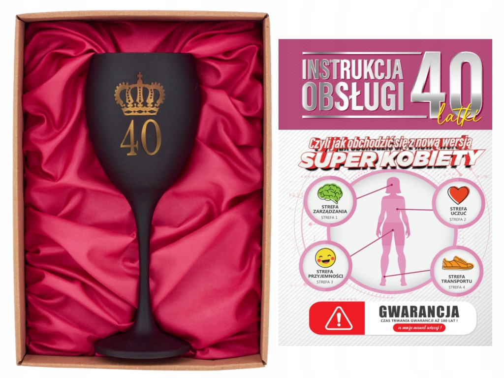 Elegancki, matowy kieliszek do wina udekorowany pięknym grawerem z okazji 40 Urodzin. Doskonały prezent na wyjątkową okazję. Zapakowany w kartonowe pudełko, wypełnione satyną w kolorze różowym. Idealny sposób na celebrowanie tego wyjątkowego momentu w życiu.