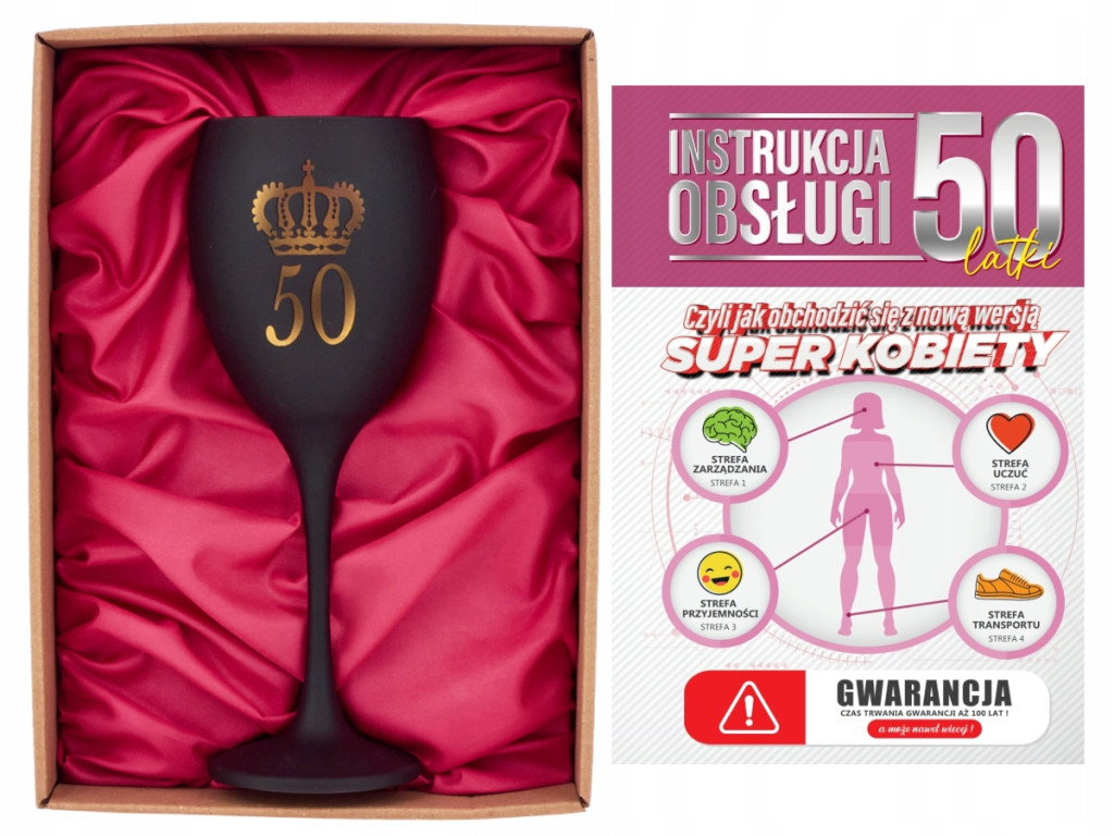 Elegancki, matowy kieliszek do wina udekorowany pięknym grawerem z okazji 50 Urodzin. Doskonały prezent na wyjątkową okazję. Zapakowany w kartonowe pudełko, wypełnione satyną w kolorze różowym. Idealny sposób na celebrowanie tego wyjątkowego momentu w życiu.