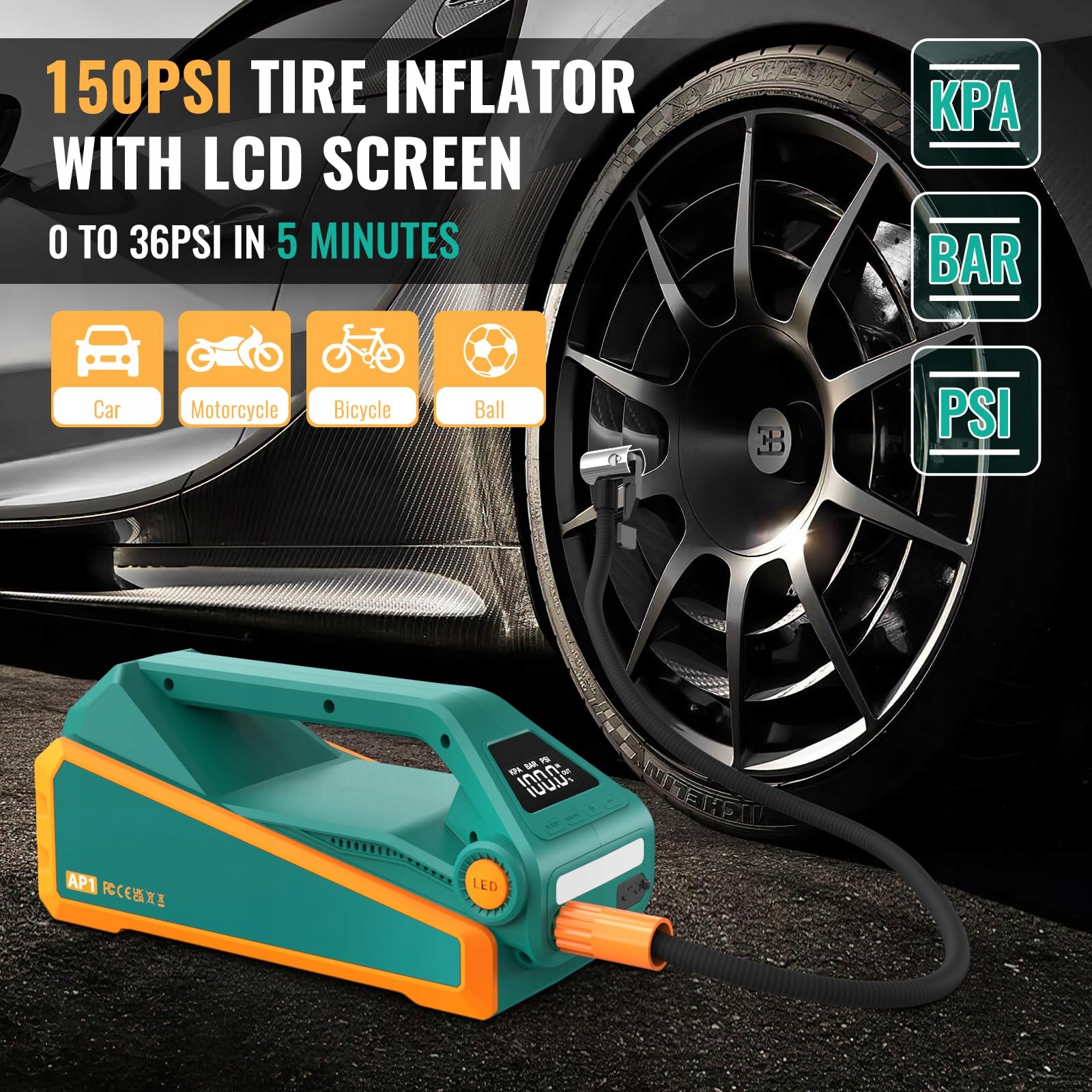 • [150PSI Cyfrowa Pompka Powietrza]Wbudowany kompresor powietrza ma maksymalne ciśnienie powietrza 150 PSI i może napełnić opony samochodowe w zaledwie 5 minut z 0 do 36 PSI. Ta starthilfe powerbank o wysokiej precyzji i jasnym wyświetlaczu może dokładnie napompować Twoje opony (samochód/motocykl/rower) oraz inne przedmioty, takie jak piłki, do żądanej wartości.