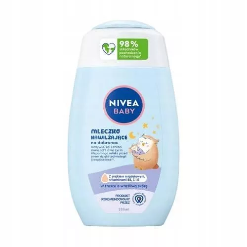 NIVEA BABY Mleczko Nawilżające na dobranoc - odżywia, koi i chroni skórę od 1. dnia życia. NIVEA BABY Mleczko Nawilżające na dobranoc, które nie tylko koi, ale także pomaga chronić i wzmacnia skórę dziecka, wspierając jej naturalny proces rozwoju od 1. dnia życia. Formuła z technologią SleepEssence™ wspomaga relaks dziecka przed snem. Zawiera w 100% naturalny olejek migdałowy i witaminy B5, C i E.