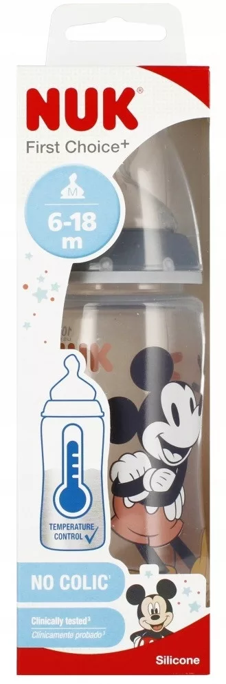 Nasze butelki do nauki picia z Myszką Miki pomagają dzieciom w nauce samodzielnego picia. Postaci z jednej z najbardziej popularnych bajek Disneya w nowoczesnym wydaniu zdobią nasze butelki do nauki picia oraz cieszą zarówno młodych, jak i starszych fanów. Wejdź w wyjątkowy świat Myszki Miki i Mini! Pojawienie się dziecka to wielka rewolucja w życiu. Wtedy dodatkowe zabezpieczenie sprawia, że jesteście spokojniejsi. Butelki NUK First Choice+ z czujnikiem temperatury pokazują, gdy zostanie osiągnięta właściwa temperatura pokarmu. Skala na butelce z czujnikiem temperatury zmienia kolor w zależności od temperatury zawartości. Jeżeli pokarm jest za gorący, zwykle niebieski wskaźnik zmienia kolor na biały. Uwaga: Wskaźnik temperatury NUK jest przewidziany jako dodatkowa weryfikacja. Prosimy o sprawdzenie temperatury bezpośrednio przed podaniem pokarmu dziecku. Butelka posiada naturalny i odpowiedni dla szczęki, szczególnie miękki smoczek silikonowy, 6-18 miesięcy, M (do mleka modyfikowanego) oraz antykolkowy system odpowietrzania NUK Air System który zapewnia swobodny wypływ pokarmu.