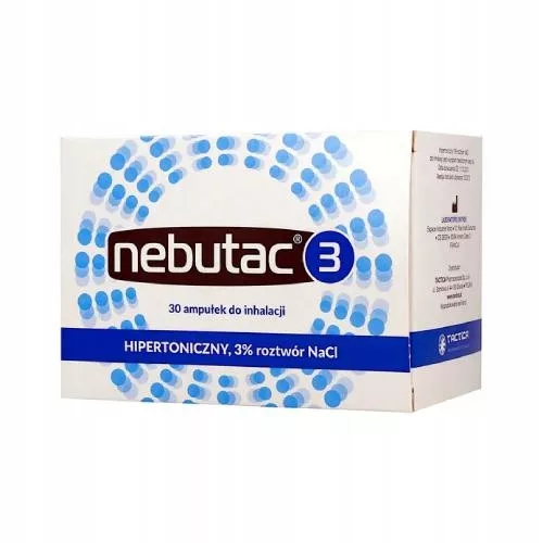 Nebutac 3 to sterylny wyrób medyczny - hipertoniczny roztwór chlorku sodu przeznaczony do inhalacji. Pobudza usuwanie wydzieliny w dolnym odcinku dróg oddechowych na skutek osmotycznego działania soli. Zapobiega nadmiernemu wysuszeniu śluzówki drzewa oskrzelowego.