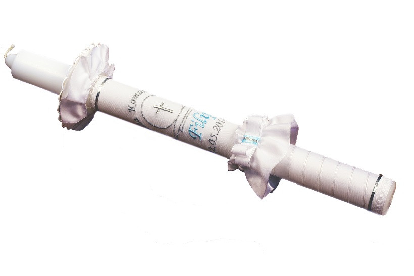 W skład zestawu wchodzi: świeca, okapnik wg zdjęcia i białe pudełko. Świeca parafinowana - długość 39 cm. średnica 3cm.