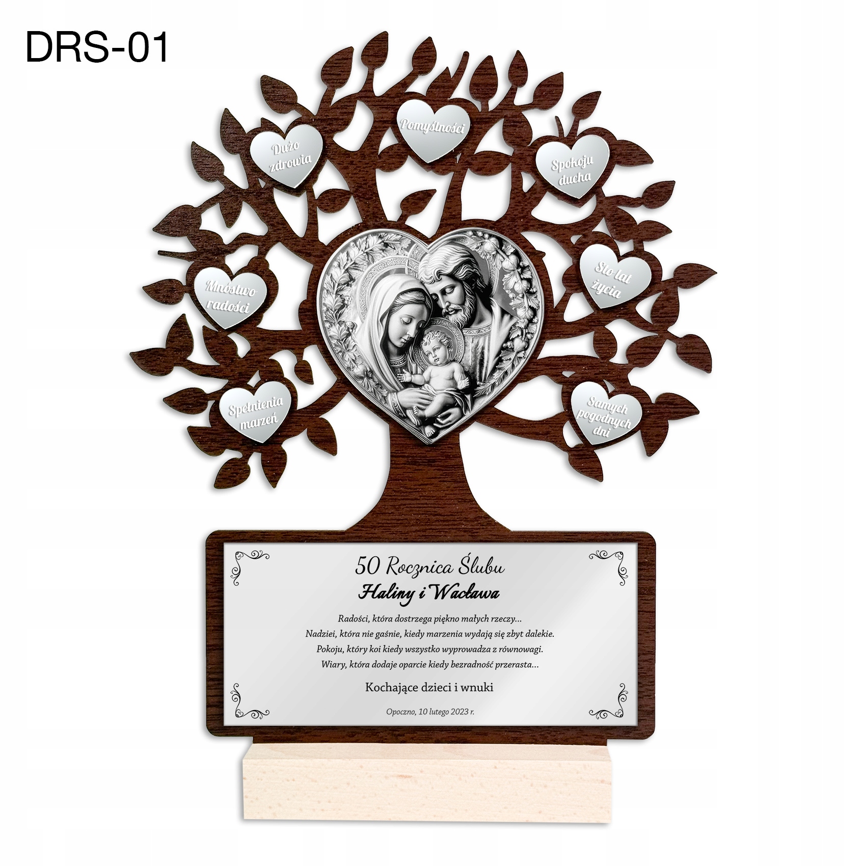 Jeśli szukasz eleganckiego i osobistego prezentu na jubileusz ślubu, Drzewko Szczęścia z obrazem Świętej Rodziny to idealny wybór. Wykonane z solidnego drewna MDF, z pięknymi detalami i lustrzanym wykończeniem, będzie wyjątkową pamiątką dla rodziców, dziadków czy bliskich. Dzięki personalizowanym elementom, takim jak srebrne serca i tabliczka z dedykacją, prezent staje się wyjątkowy i dostosowany do okazji. To piękny symbol miłości i wsparcia, który na długo zostanie w pamięci obdarowanych.