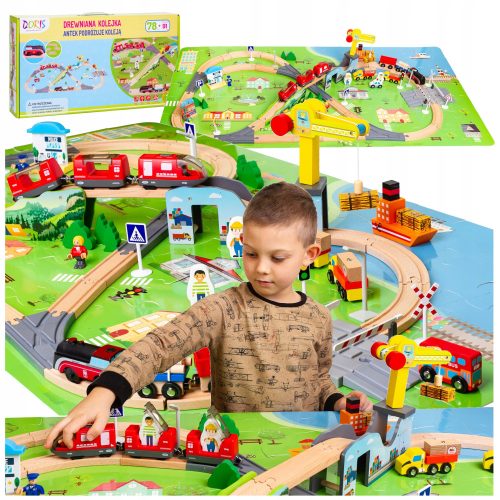 Drewniany tor kolejowy posiada skomplikowane kształty i rozjazdy, most oraz port z ruchomym dźwigiem do załadunku oraz kompletną zabudową i akcesoriami sprawdzi się zarówno do emocjonującej jak i kreatywnej zabawy.