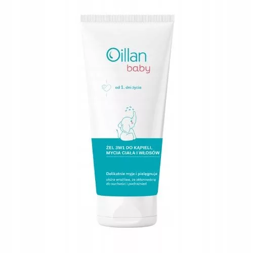 Oillan Baby Żel 3w1 do kąpieli, mycia ciała i włosów to kosmetyk polecany od pierwszych dni życia. Specjalna mało-pieniąca formuła preparatu oparta na łagodnych substancjach zapewnia wyjątkowe bezpieczeństwo dla skóry wrażliwej, atopowej i skłonnej do alergii.