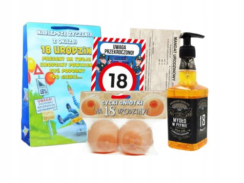 W zestawie znajdują się mydło w płynie, cycek gniotek, mandat urodzinowy oraz torebka prezentowa.