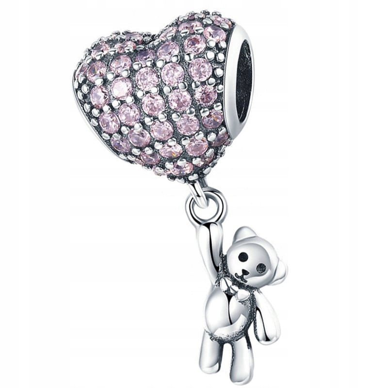 Przepiękna zawieszka przedstawiająca misia trzymającego duży, różowy balon w kształcie serca, wysadzany cyrkoniami najwyższej jakości.