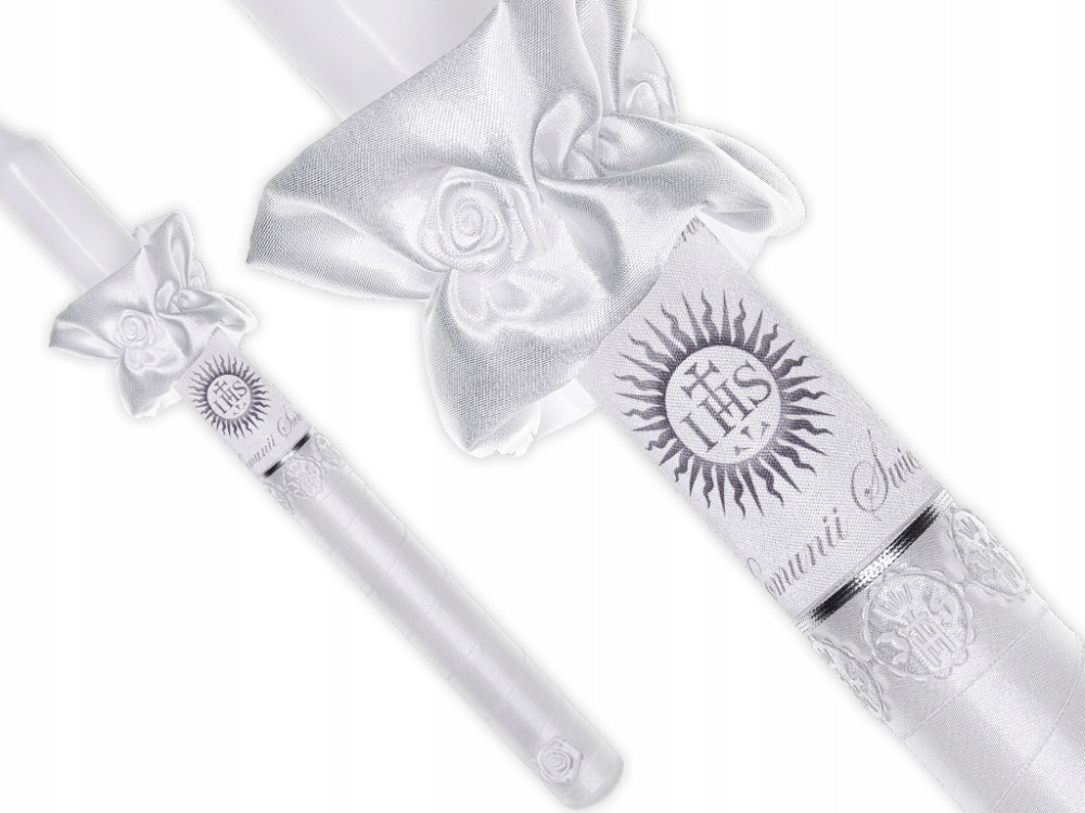 to świeca stylizowana białą satyną z dodatkiem srebrnej nitki wokół oraz białą aplikacją z symbolem IHS. Okapnik zdobiony różyczkami nadając szyku i prostocie podkreślając uroczystość I Komunii Świętej.