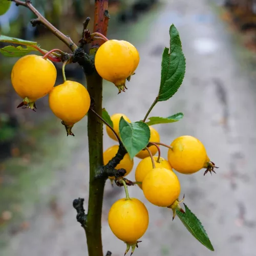 Efektownie owocująca, szybko rosnąca jabłoń o luźnej koronie i wyprostowanych gałęziach, dorastająca do 5 m wysokości oraz 3,5 m szerokości. Liście sezonowe, jasnozielone, przebarwiające się jesienią na czerwono. Kwiaty w pączkach bladoróżowe, po otwarciu jasnoróżowe, pojedyncze, pojawiające się w maju. Najpiękniejsza jesienią, pokryta licznymi żółtymi owocami, pozostającymi do zimy na drzewie. Owoce doskonałe na przetwory. Odmiana odporna parcha. Roślina mrozoodporna i bardzo miododajna.