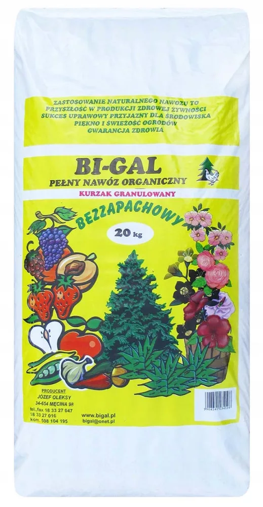 Nawóz organiczny BI-GAL produkt w pełni naturalny, produkowany w nowoczesnej fermie kur z wykorzystaniem najnowszych technologii. BI-GAL powstaje w wyniku suszenia i granulacji obornika kurzego wyłącznie naturalnymi metodami, bez chemicznych dodatków.