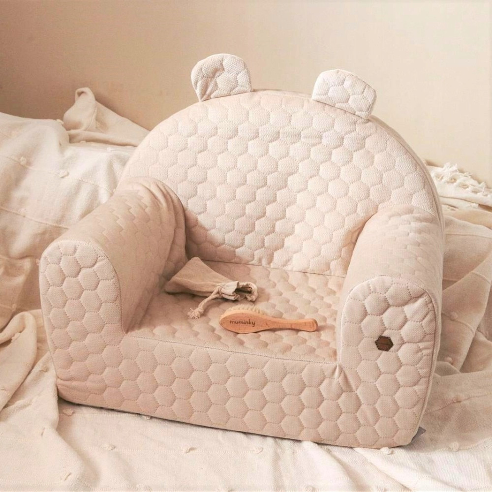 Wypełnienie fotelika stanowi miękka pianka poliuretanowa, która zapewnia wygodne i stabilne siedzisko dla dziecka. Obszycie wykonane jest z milutkiego pikowanego Velvetu w formie zdejmowanego pokrowca zapinanego na zamek, które nadaje się do prania. Oparcie fotelika zdobią uwielbiane przez dzieci malutkie uszka misia.