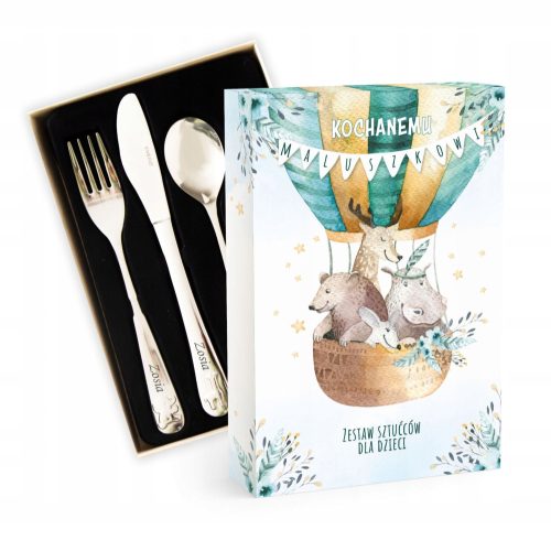 Oferujemy Państwu produkt idealnie nadający się jako prezent z okazji Roczku. Produkt, który spełni oczekiwania najbardziej wymagającego klienta. Sztućce dziecięce zapakowaliśmy w pudełko, które posiada "coś", czego nie można pokazać na zdjęciach! Pokryliśmy je folią "soft-touch". Dzięki temu mamy wrażenie dotykania jedwabiu lub aksamitu. Takie nasze małe arcydzieło :) W zestawie kartka z życzeniami zaprojektowana w takim samym motywie graficznym.