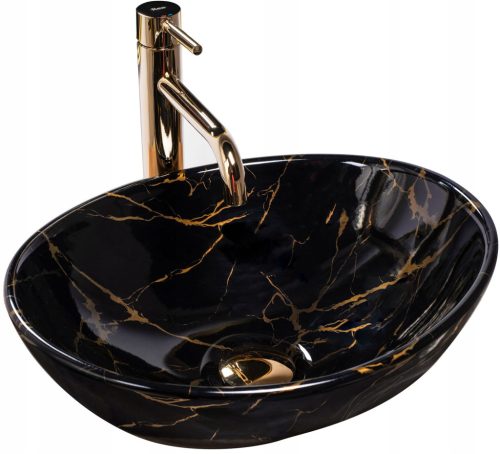 Umywalka ceramiczna SOFIA Marble to wybór dla najbardziej wymagających klientów. Ta nowoczesna, niezwykle elegancka umywalka nablatowa w czarnym kolorze została wykończona unikalnym wzorem nawiązującym do wyglądu naturalnego marmuru. Każdy egzemplarz posiada niepowtarzalny wzór.