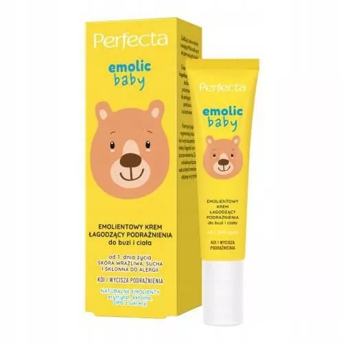 PERFECTA Emolic Baby Emolientowy krem łagodzący podrażnienia do buzi i ciała przeznaczony jest do pielęgnacji miejsc podrażnionych i zaczerwienionych. Krem przyspiesza regenerację naskórka, koi i wycisza podrażnioną skórę, łagodzi i zmniejsza zaczerwienienia. Zawiera unikalne połączenie naturalnych emolientów, ektoiny i erytrytol.