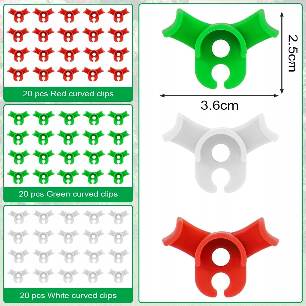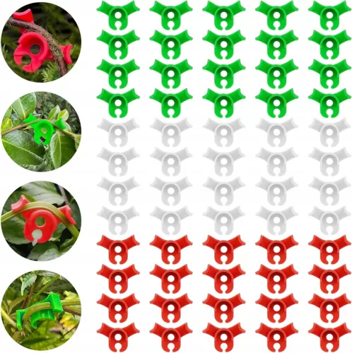 Produkt zawiera 120 klipsów w kolorach czerwonym, zielonym i białym. Rozmiary: duże 3,6 x 2,5 cm i małe 3,3 x 1,3 cm. Wytrzymałe tworzywo sztuczne zapewnia stabilne podtrzymanie bez uszkodzeń łodyg. Idealne do prowadzenia pędów, pnączy i sadzonek w namiotach uprawowych, szklarniach i ogrodach na świeżym powietrzu. ????????