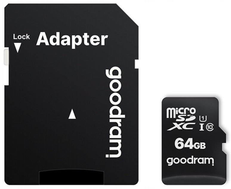 Karta microSDHC o pojemności 64 GB. Charakteryzuje się prędkością odczytu 100 MB/s oraz prędkością zapisu 10 MB/s. Zestaw zawiera adapter.