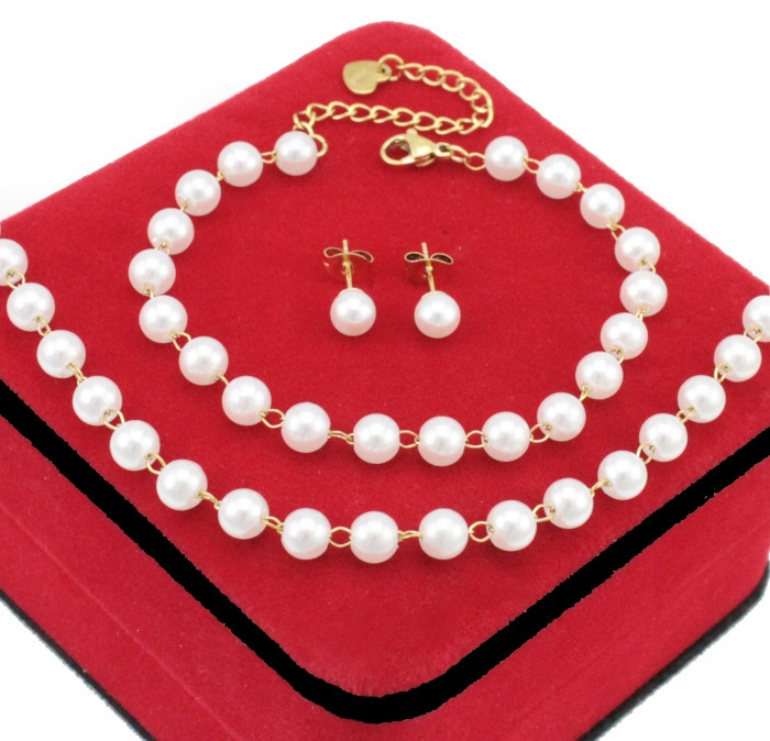 • Wymiary : długość naszyjnika 40 cm plus 5 cm regulacja , kolczyki 6 mm , bransoletka długość 17 cm plus 4 cm regulacja , wielkość perły w naszyjniku i bransoletce 0,7 cm