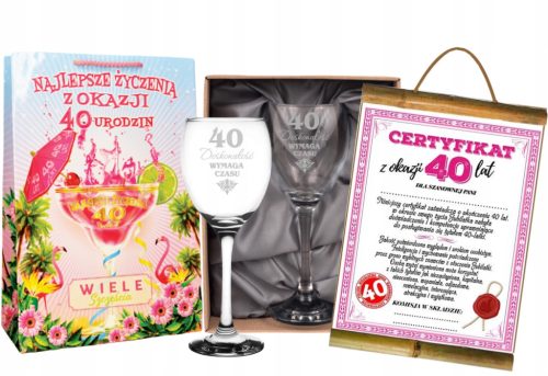 Elegancki szklany kieliszek udekorowany napisem "40 Doskonałość wymaga czasu". Delikatne grawerowane zdobienia dodające uroku. Zapakowany w prezentowe pudełko wypełnione satyną, gotowe do wręczenia jako prezent!