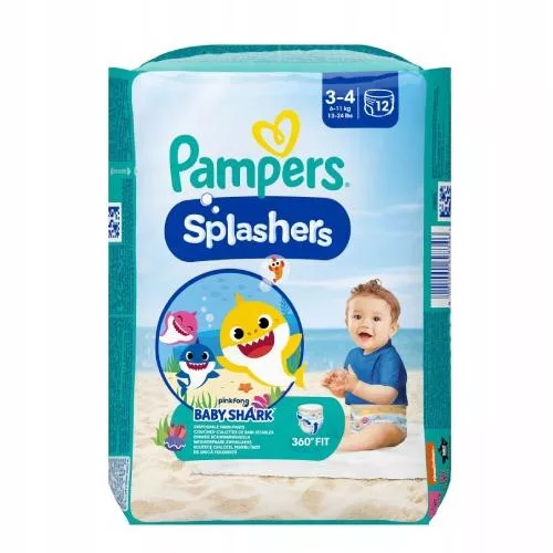 Dzięki jednorazowym pieluchom do pływania Pampers Splashers Twoje dziecko może pluskać się do woli. Pampers Splashers nie pęcznieją w wodzie jak zwykłe pieluszki: zapewniają wygodne dopasowanie i zapewniają ochronę typową dla pieluszek Pampers. Dzięki uroczym grafikom z motywem Baby Shark skradną serca maluszków.