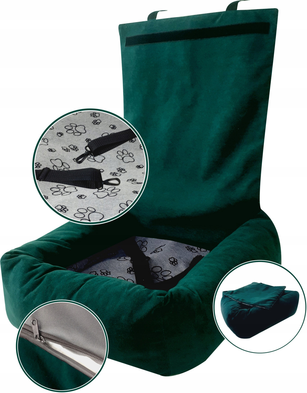 Fotelik samochodowy dla psa montowany jest do fotela samochodowego za pomocą dwóch regulowanych pasów taśmy (na zagłówek i z tyłu fotela). Wewnątrz transportera znajduje się metalowe mocowanie, do którego możemy przypiąć obrożę psa. Siedzisko wykonane zostało z odpornej na zaciągnięcia, mięciutkiej i wytrzymałej certyfikowanej tkaniny Velvet. Spód fotelika wykonany z wytrzymałej tkaniny wodoodpornej. Transporter zapewni właścicielowi czystość w samochodzie. Fotelik jest w całości rozbieralny, co oznacza że możemy ściągnąć pokrowiec, który jest zapinany na zamek błyskawiczny i wyprać zgodnie z zaleceniami na metce. Cała konstrukcja zapewnia wygodę i bezpieczeństwo naszym pupilom podczas podróży. Fotelik z łatwością można przekształcić w legowisko - wystarczy zwinąć oparcie wraz z pasami i zapiąć na rzep. Wszystkie komponenty wykorzystane do produkcji posiadają niezbędne atesty i certyfikaty. Wszystkie te elementy składają się na zapewnienie jak największego bezpieczeństwa pupilowi.