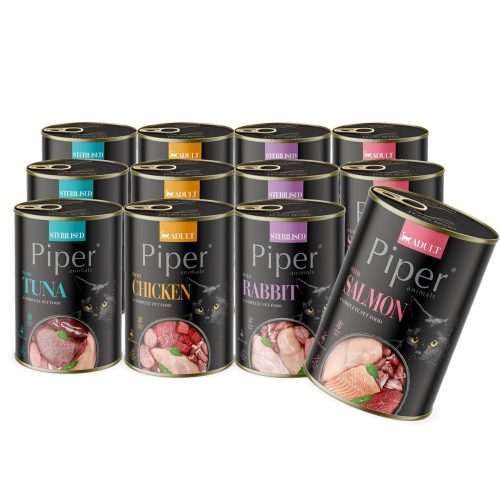 Skład: mięso i produkty pochodzenia zwierzęcego 55% (mięso wołowe 10%, filet z kurczaka 5%, mięso wieprzowe 5%, serca z kurczaka 3%, żołądki z kurczaka 3%), rosół, ryby i produkty rybne (filet z łososia 10%), substancje mineralne, oleje i tłuszcze (olej lniany 0,2%), kocimiętka suszona 0,01%.