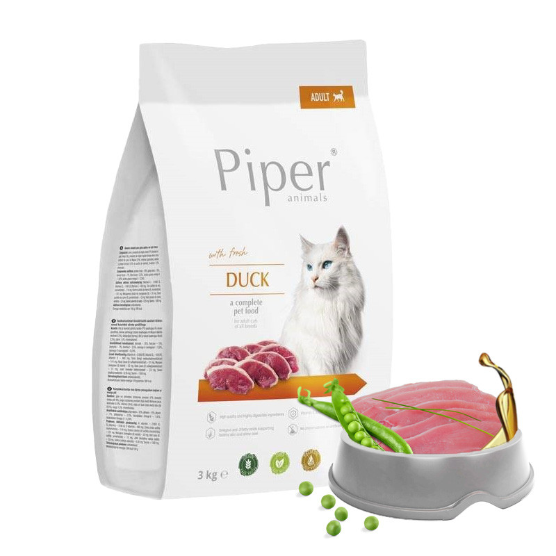 Sucha karma PIPER ANIMALS z kaczką w pełni odpowiada wymaganiom żywieniowym dorosłego kota. Jej zbilansowany skład sprawia, że może być stosowana jako jedyny pokarm w jego codziennej diecie, bez konieczności suplementacji i uzupełniania innymi karmami. Źródłem wysokiej jakości białka i tłuszczu są mięso i produkty pochodzenia zwierzęcego, w tym z kaczki. Tłuszcz drobiowy, jako jeden z nielicznych, jest źródłem wielonienasyconych kwasów tłuszczowych z rodziny n-6, regulujących m.in. pracę serca i układu nerwowego. Jukka Mojave i zawarte w niej saponiny zapewniają prawidłowe funkcjonowanie przewodu pokarmowego, pobudzając wydzielanie soków trawiennych. Sucha karma Piper Animals ze świeżą kaczką pokrywa zapotrzebowanie na niezbędną dla kota taurynę, która odpowiada m.in. za opóźnienie procesów starzenia organizmu.