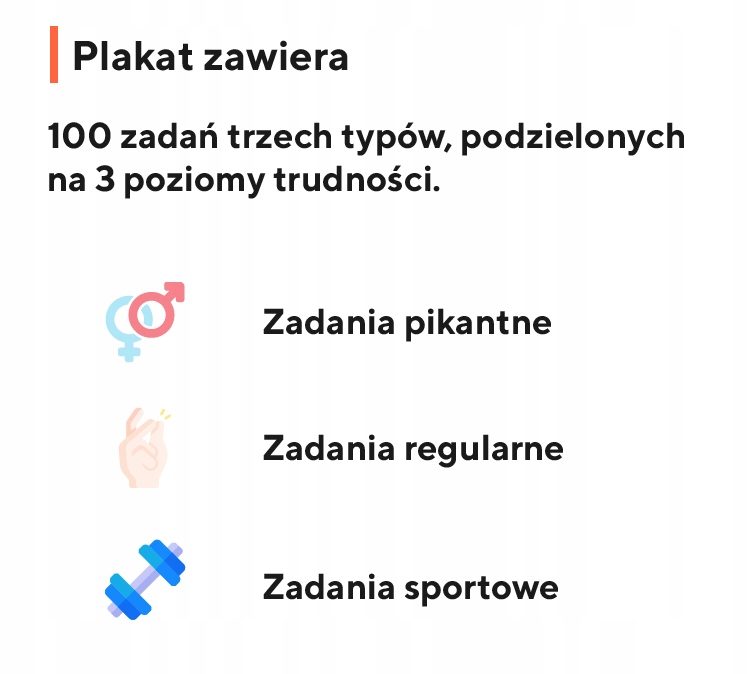 Zdrapka Przeżyć dla Pary to coś więcej niż przedmiot – to plakat do zdrapywania, który zawiera ponad 100 propozycji przeżyć, dzięki którym wspólne chwile staną się niezapomniane, a w związku nie będzie miejsca na nudę. Wystarczy wybrać, a następnie zdrapać pole, aby zacząć wspólną przygodę i podkręcić atmosferę odrobiną niepewności.