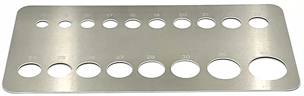 Posiada 18 otworów o średnicy: 14, 15, 16, 17, 18, 19, 20, 21, 22, 23, 24, 25, 26, 27, 28, 30, 35, 40 mm.