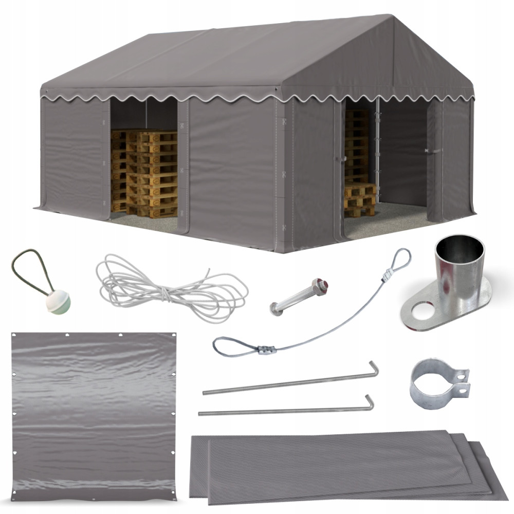 1 - Dach PE (polietylen) 240g/m2 2 - Brama typu kurtyna 3 - Mocne zamki YKK przy wjazdach 4 - Wymienne maskownice 5 - Ściany boczne PE ok. 2 x 2 m (polietylen) 240g/m2 6 - Oczka mocujące plandekę