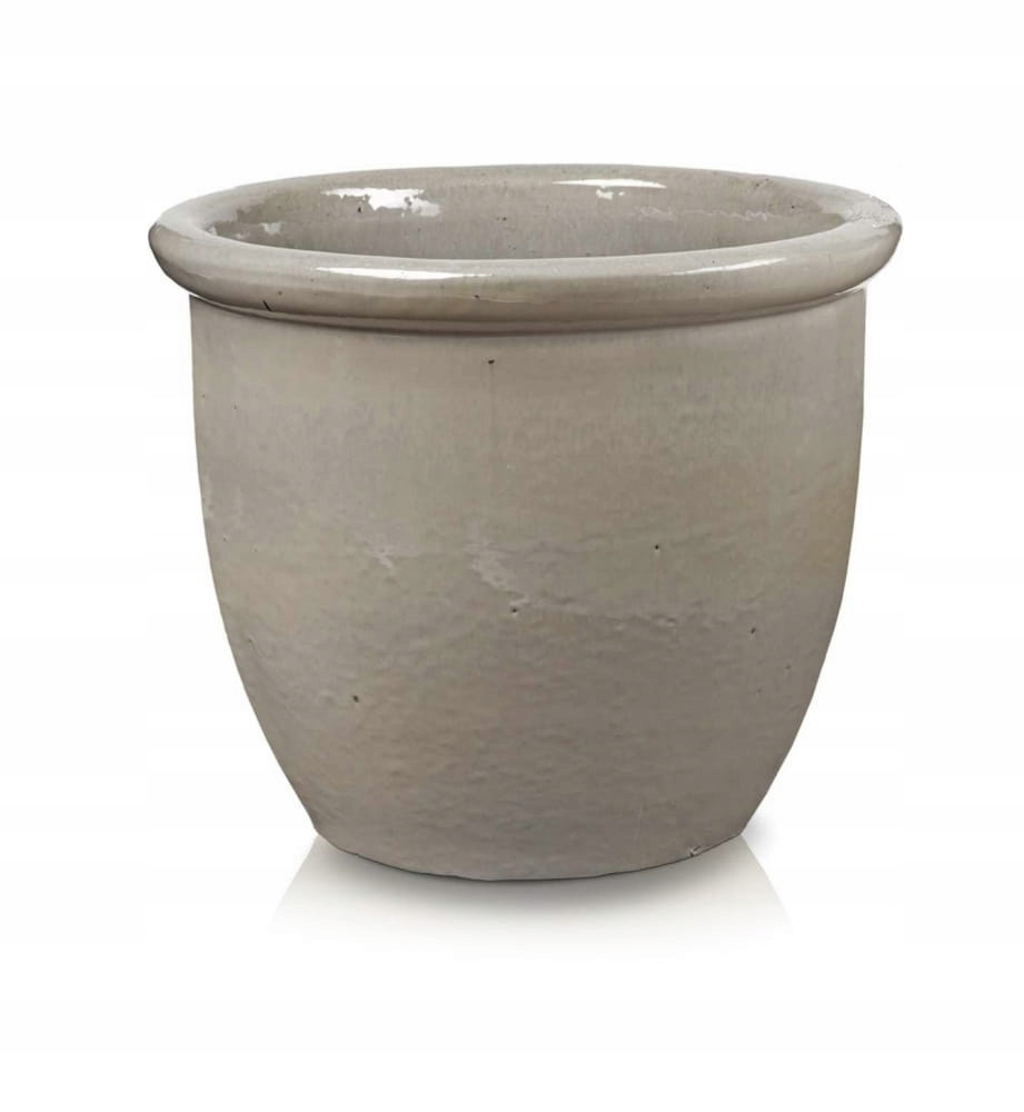 Klasyczna donica szkliwiona o okrągłej podstawie i pogrubionym rancie.