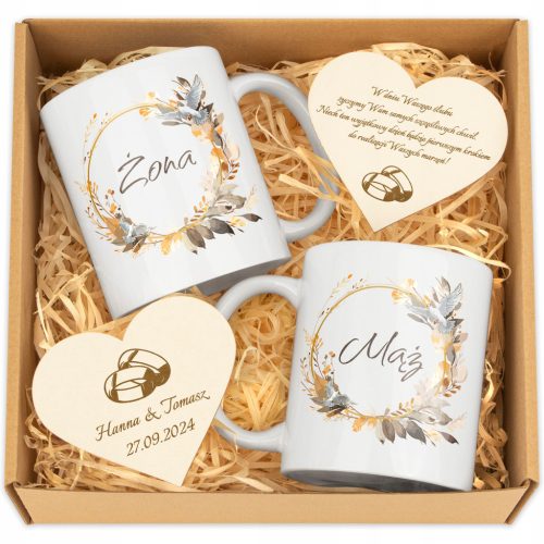 Szukasz wyjątkowego prezentu dla pary młodej, który połączy styl, elegancję i praktyczność? Mamy dla Ciebie idealne rozwiązanie! Oferujemy piękny zestaw, składający się z dwóch kubków z nadrukiem oraz serca grawerowane wszystko starannie zapakowane w ozdobnym pudełku.