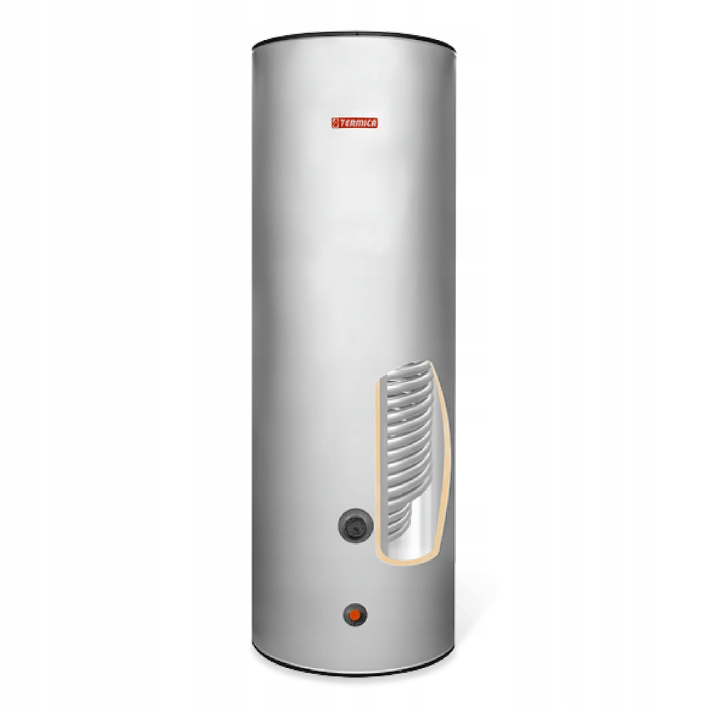 Termica WW200PCE wymiennik stojący, izolowany o pojemności 200 litrów z jedną wężownicą o powierzchni 2,0 m² . Przeznaczony do współpracy z pompami ciepła. Zbiornik i wężownica ze stali nierdzewnej, nie wymaga stosowania anody ochronnej. W zestawie zawór bezpieczeństwa.