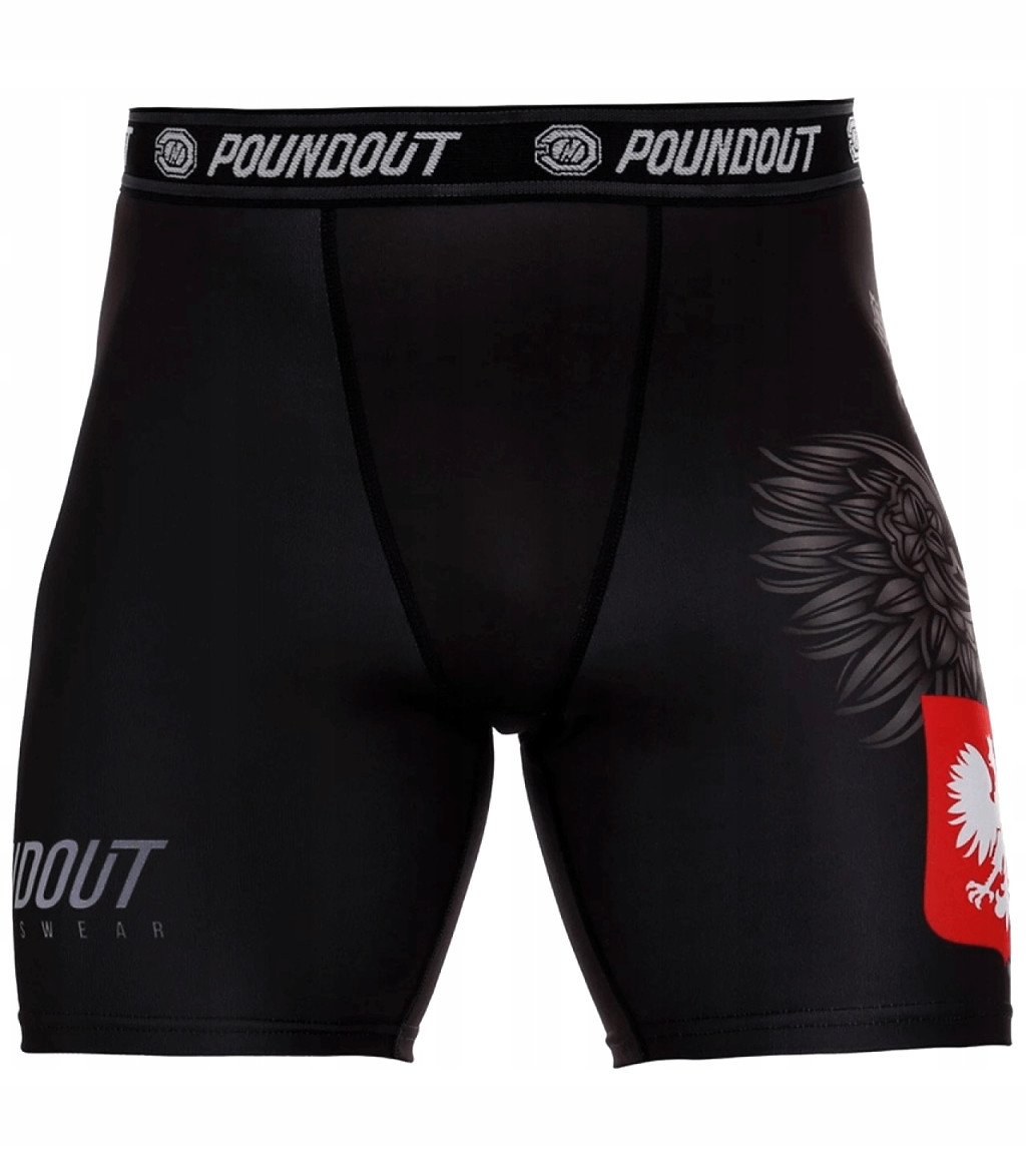 Spodenki posiadają elastyczne, płaskie szwy zapobiegające otarciom i nie podrażniające skóry. Te czarne szorty zdobią atrakcyjne nadruki wykonane metodą sublimacji: logo Poundout oraz godło Polski z motywem orła w tle. Elementy te charakteryzuje trwałość i nieścieralność. Spodenki są niezwykle wygodne i nie wywołują nawet najmniejszego dyskomfortu podczas treningu. Są idealne zarówno dla sportowców wyczynowych, jak i dla amatorów.