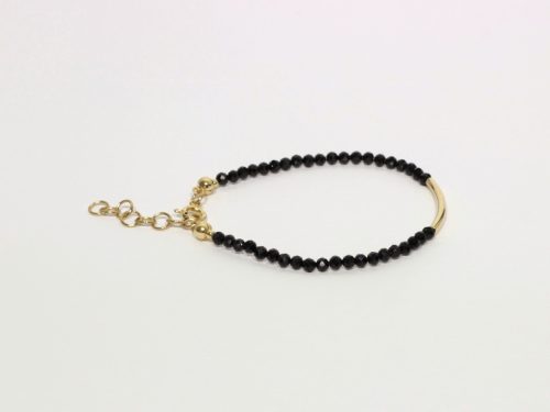 Bransoletka w całości wykonana z najwyższej jakości srebra próby 925, starannie pokrytego 4 um warstwami 24 i 18 karatowego złota. Na linkę jubilerską nawleczono 3,5 mm fasetowane kamienie spinelu, w kolorze czarnym. Bransoletka prezentuje się bardzo efektownie i klasycznie.