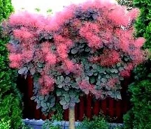 PERUKOWIEC NA PNIU PROWADZONY CZERWONY jest to krzew, którego koronka szybko rozrasta się a pień pogrubia się przez to nadaje się do sadzenia w donice na tarasie jak i do małego przydomowego ogrodu.