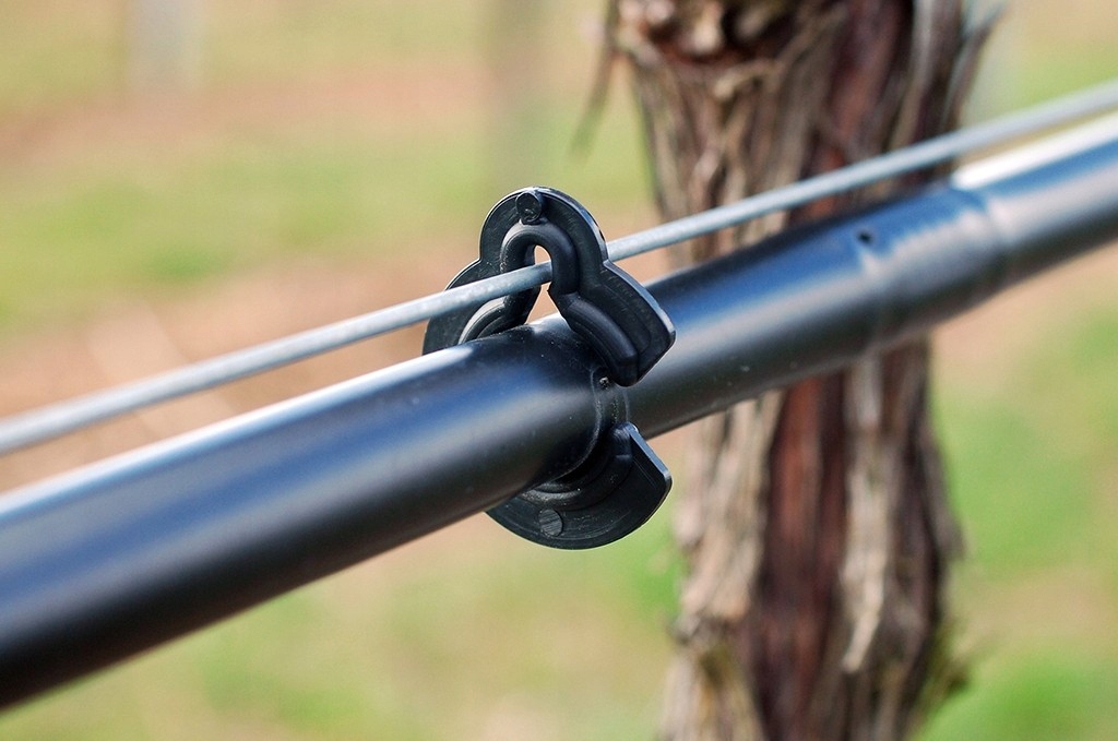 Klips do węża służy do mocowania węży irygacyjnych do drutu naciągowego (do ø 3,1 mm). Woda płynąca wzdłuż węża spływa z zacisku węża przez żebro.