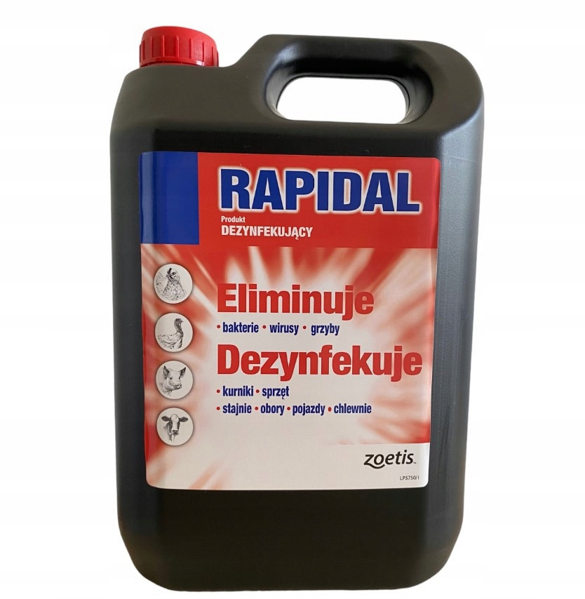 Rapidal to środek w 5L baniaku przeznaczony do dezynfekcji powierzchni I pomieszczeń, w których przebywają zwierzęta gospodarskie oraz sprzętów mających związek z pobytem lub transportem zwierząt. Ze względu na szerokie spektrum działania Rapidal może pełnić również rolę detergentu i służyć do mycia różnego rodzaju powierzchni.