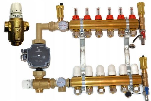 Zestaw mieszający rozdzielacza mosiężnego 3 sekcje polskiego producenta (atest) w gatunku CW617N (woda pitna) z wysokiej jakości pompą energooszczędną firmy GRUNDFOS UPM3 AUTO L 25-70