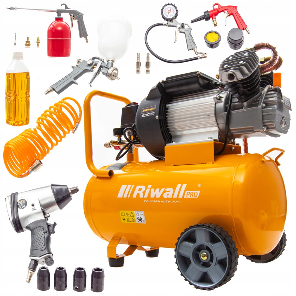 W zestawie do tego niepowtarzalnego kompresora olejowego dwutłokowego RIWALL dodał niepowtarzalny zestaw akcesoriów.