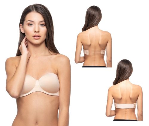 Lekki, cielisty biustonosz samonośny pięknie modelujący biust z wymiennym tyłem. Zapinany po bokach, do wyboru tył materiałowy lub silikonowy. Miseczki z zewnątrz obszyte gładkim materiałem. Zapewnia efekt push-up. Całość wykonana bezszwowo, dzięki czemu stanik nie odznacza się nawet pod obcisłą kreacją. Zapewnia naturalny wygląd i komfort.