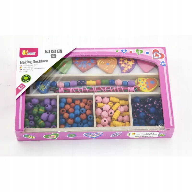 Koraliki do nawlekania Viga Toys to zestaw elementów, z których można stworzyć dowolną kompozycję. Dodatkowo, w zestawie znajduje się 5 sznurków, na które nawleka się ozdoby, oraz 8 różnych serduszek, które mogą być zwieńczeniem bransoletki lub naszyjnika.