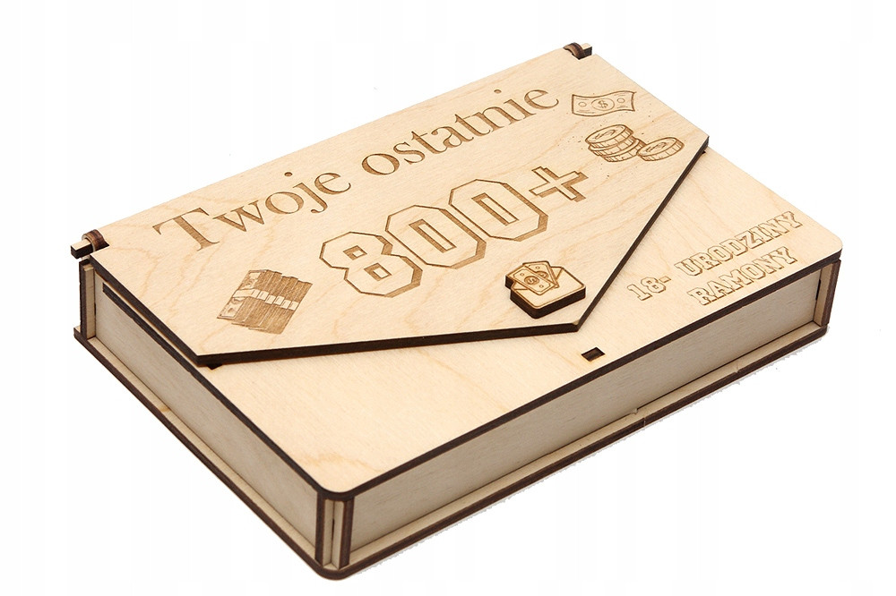 Nasza drewniana koperta na pieniądze ucieszy i będzie ciekawą pamiątką dla solenizanta. Do środka można włożyć banknoty, a wygrawerowane życzenia na wieczku zastąpią klasyczną kartkę.