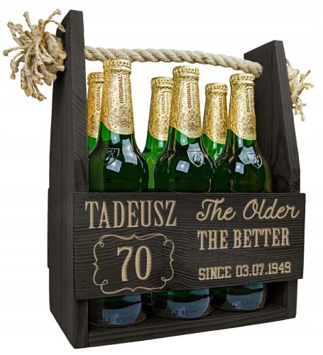 Ta čudovita lesena škatla je popolno darilo za ljubitelje piva ob praznovanju rojstnega dne. Škatla sprejme šest buteljk ali pločevink piva ter je opremljena z nosilom iz masivnega lesa, ki je pobarvan v temen odtenek. Nosilec ima ročaj iz debelega pletenega vrvi, ki omogoča enostavno prenašanje. Grawer na škatli je izdelan z moderno lasersko metodo, kar zagotavlja visoko kakovost in natančnost. Dimenzije nosilca so 25,5 x 32 x 15,5 cm. *Buteljke niso vključene v komplet. Po nakupu navedite: - številko vzorca - ime/starost/leto/datuma/podpisa - odvisno od izbranega vzorca. Izberite med različnimi vzorci, ki bodo še posebej prilagojeni praznovanju rojstnega dne. Ta škatla za pivo je zagotovo izjemen in edinstven spominek za posebno priložnost!