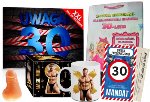 Z przodu umieszczona została zabawna grafika oraz tekst "UWAGA PRZEKROCZONO 30! ABY DALEJ RUSZYĆ W ŚWIAT OBOWIĄZKOWO PRZYJMIJ URODZINOWY MANDAT".