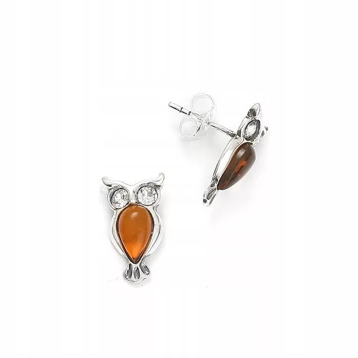SREBRNE KOLCZYKI SÓWKI Z BURSZTYNEM